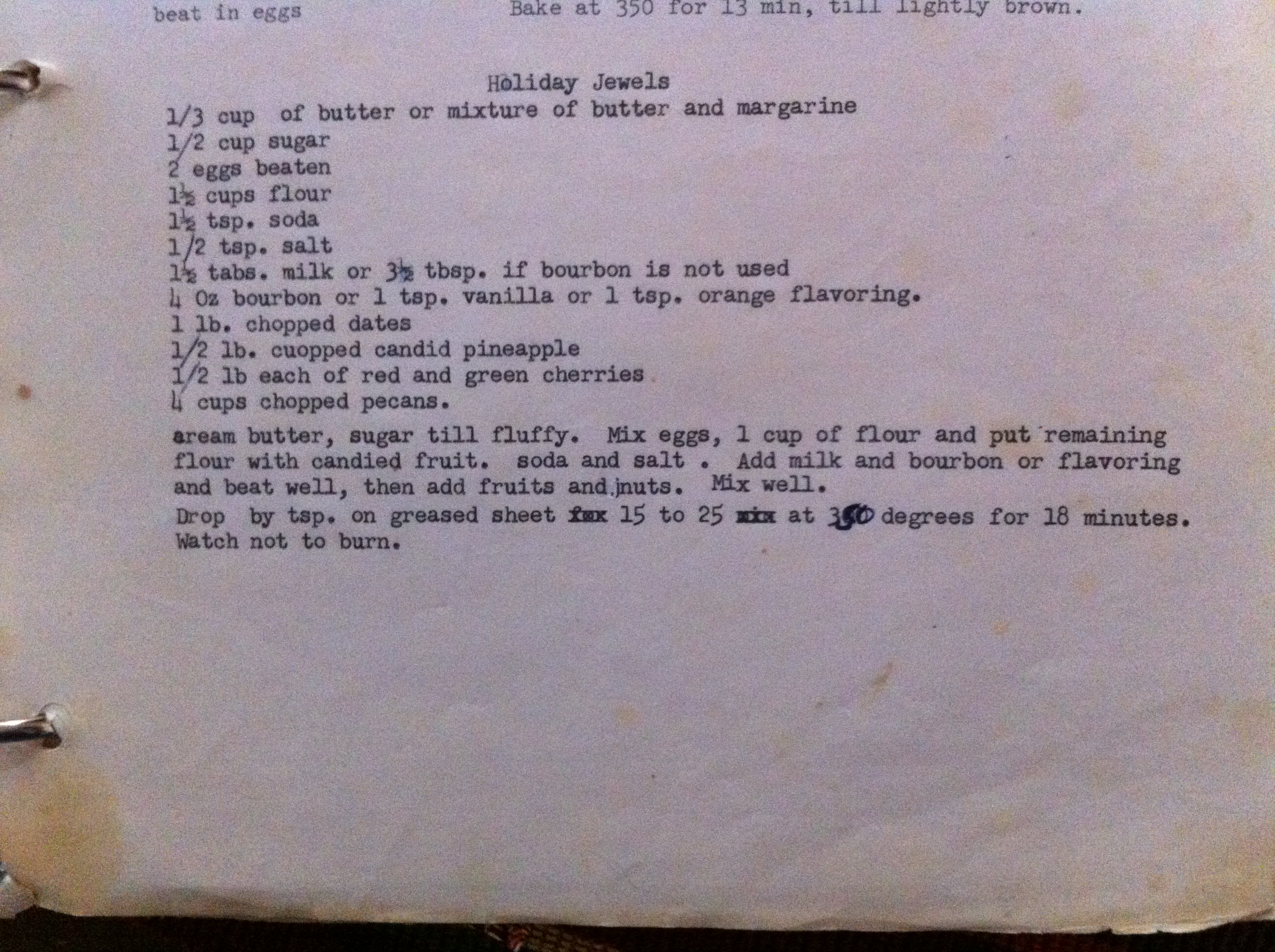 If you love fruitcake and want a different way to make it, this is a great recipe. My mother would be mortified if she knew I was posting her original hand typed recipe, typo’s and all, for the public to see!