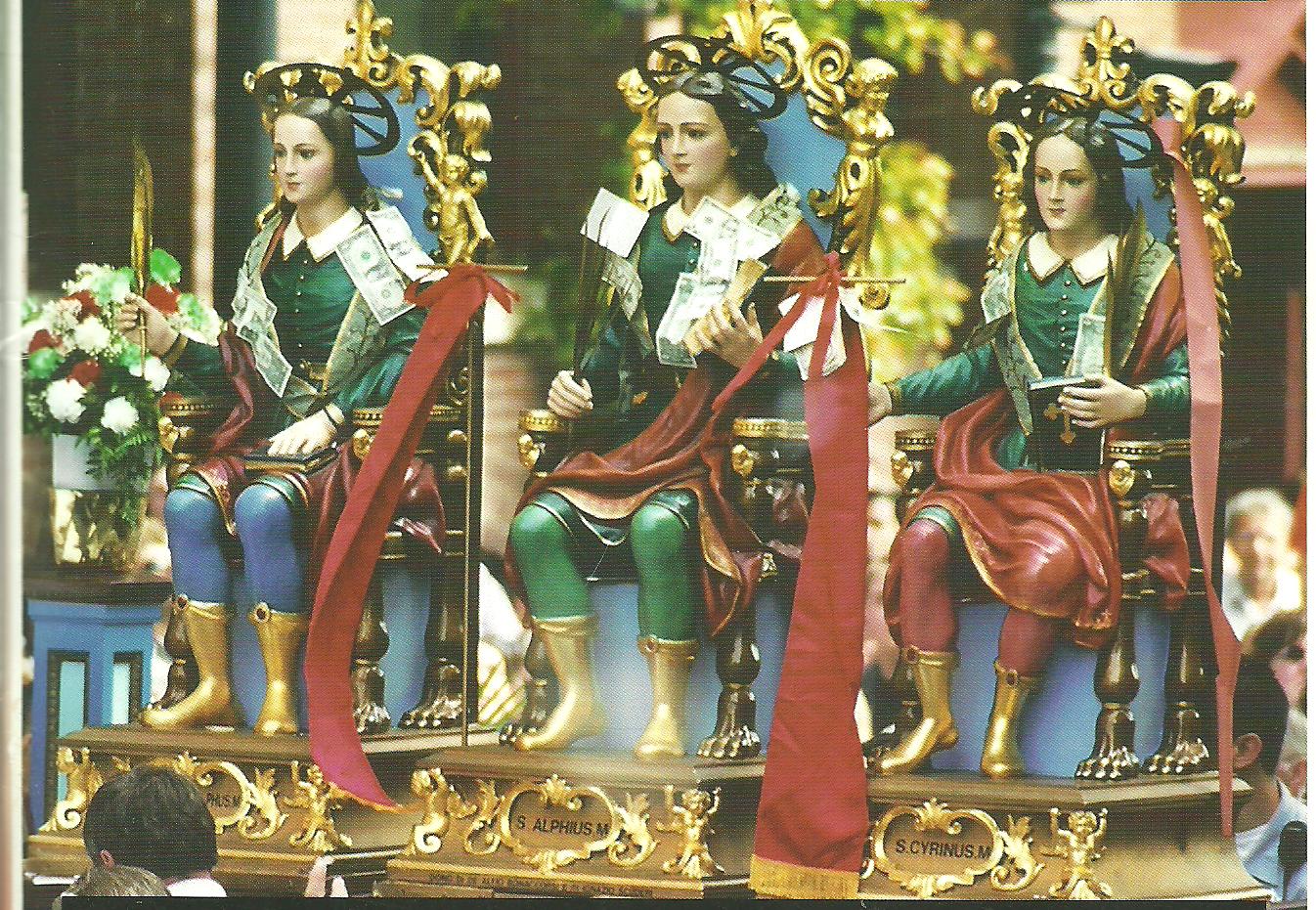 Born in the third century in southeastern Italy during the Roman persecution of the Christians, the brothers Alfio, Filadelfo and Cirino were educated in the Christian faith. As young boys, they witnessed the persecution and martyrdom of their mother. The Roman Court knew that the Three Brothers were Christians from a noble family and tried to make them turn away from Christianity and worship pagan gods.